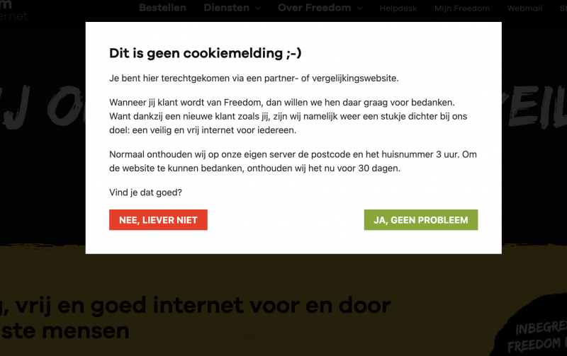 Freedom strijdt voor een veilig en vrij internet. Het online volgen van mensen, persoonsgegevens opslaan en profilering, dat vinden wij maar niks. Maar we moeten onze motor wel draaiende houden en daarvoor hebben we o.a. leden nodig. Via diverse manieren brengen we onze naam onder de aandacht, zodat steeds meer Nederlanders ons kennen en overstappen. Gaat dat dan wel op een veilige en vriendelijke manier, zul je nu wellicht denken? Het antwoord is ja! Over ieder in te zetten middel of kanaal, wordt eerst goed nagedacht. Zo worden bijvoorbeeld privacyverklaringen van partners grondig onder de loep genomen en waar nodig aangepast. Of worden bepaalde toepassingen uitgeschakeld, zoals tracking-pixels. Een mooi nieuw voorbeeld is het affiliate programma. Stiekem zijn we best wel trots op deze unieke nieuwe samenwerking, we vertellen je er graag meer over!